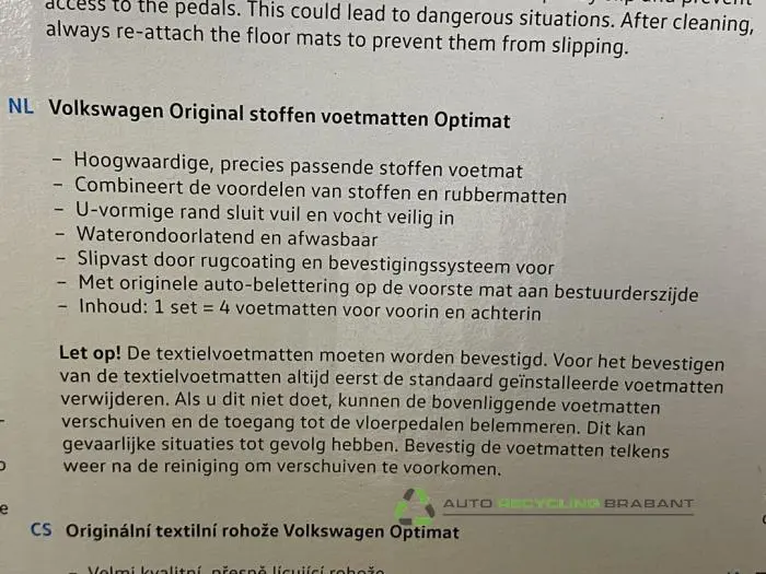 Benötigen Sie Matten Set für Volkswagen Golf? Direkt online bestellen und sicher bezahlen. Die Gebrauchtteileplattform für Privat- und Geschäftskunden. Der Matten Set für Volkswagen Golf ist jetzt in unserem automatischen Lager verfügbar, das gebrauchte und neue Teile in Originalqualität lagert. Hervorragende Garantiebedingungen, schneller Versand, Telefon- und Online-Teile-Helpdesk sind beim Kauf von technischen oder Karosserie-Autoteilen bei Auto Recycling Brabant inklusive. Die Matten Set Teile können innerhalb unserer erweiterten Öffnungszeiten am Autoteileschalter abgeholt werden oder werden international geliefert