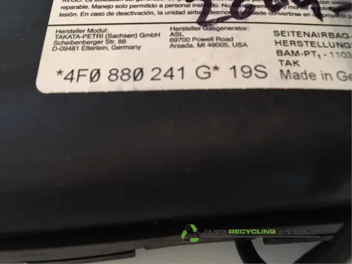 Seat airbag (seat) for Audi A6? Order directly online and pay securely. The used part platform for both private and business customers. The Seat airbag (seat) for Audi A6 is now available from our automated warehouse that stores original quality second-hand and new parts. Excellent warranty conditions, fast shipping telephone and online parts from Auto Recycling Brabant. The Seat airbag (seat) parts can be picked up at our parts desk within our extended opening hours or are delivered internationally.